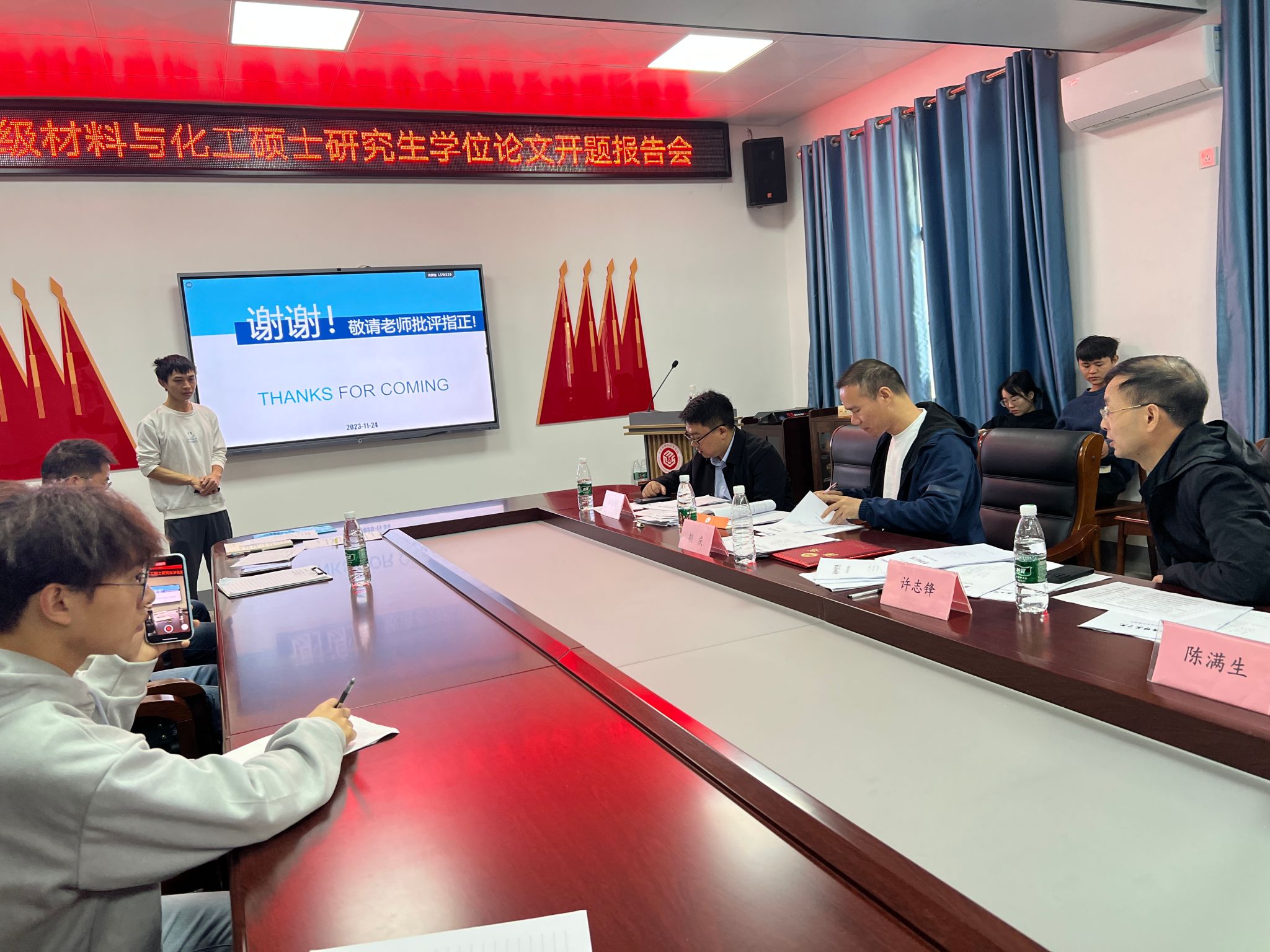 2022级材料与化工硕士研究生学位论文开题报告会于2023年11月24日上午9点在西校区化学楼105会议室举行。本次开题报告会由材料与化工校外合作导师胡庆博士任评审小组组长,许志锋教授、陈满生教授、李俊华教授、孙俊彬副教授任评审小组成员,朱小明博士担任答辩秘书。22级材料与化工研究生参与本次开题报告会,部分老师、21级和23级材料与化工硕士研究生参与旁听。