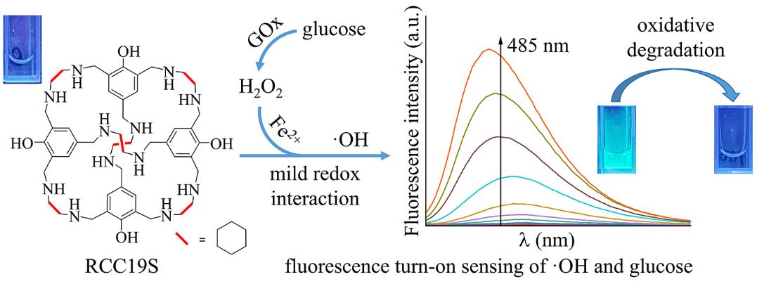 该论文是国家自然科学基金、湖南省教育厅基金等资助的重要成果之一,由代聪博士和许志锋教授共同指导完成。tyc33455cc太阳成集团为第一署名单位,徐滢为论文第一作者。论文开发了一种荧光多孔有机笼,基于多孔有机笼和羟基自由基之间的特异性氧化还原反应,实现了羟基自由基和葡萄糖的荧光增强型传感,进一步应用于实际生物样品和环境样品的检测。同时基于羟基自由基对多孔有机笼中苯环等基团的进一步氧化降解,减少了荧光传感的二次污染。