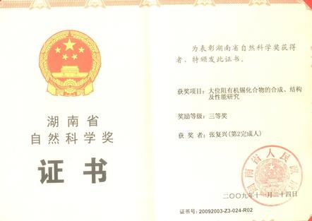 金属有机化学科研团队共由5人组成,带头人张复兴,二级教授,湖南省高校青年骨干教师,湖南省优秀教师,湖南省重点实验室主任、湖南省高校重点实验室主任、湖南省高校科技创新团队负责人,硕士生导师。团队主要研究内容为金属有机化合物的合成、结构及其性能研究。围绕金属资源的精深利用,理性设计含氮(氧)多齿配体,合成具有特殊的光电性能、抗肿瘤活性、催化性能的功能金属有机化合物,开展结构与性能的关系研究,为其在药物、材料等领域的应用提供理论基础和技术支持。近年来团队成员主持国家自然科学基金1项,湖南自然科学基金8项,湖南省科技计划项目2项,湖南省教育厅重点项目、优秀青年项目及创新平台开放基金共6项。近年来,团队成员在《Org. Lett.》、《Chem. Commun.》、《Org. Chem. Front.》、《Inorg. Chem.》、《Sci. China-Chem.》《Adv. Synth. Catal.》、《J. Inorg. Biochem.》、《结构化学》、《无机化学学报》等国内外学术刊物发表研究论文100多篇,其中SCI收录近100篇,包括一区论文4篇,二区论文8篇;获得授权发明专利59项。获湖南省自然科学三等奖1项、湖南省科学进步三等奖1项。