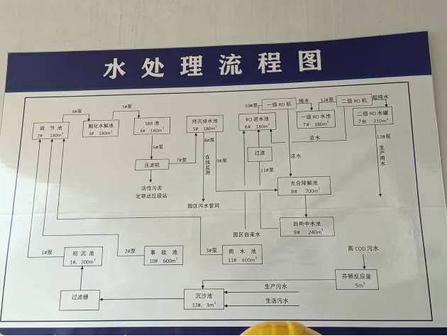 随后我们看见了冷却水塔,路过储罐区,一共有六个储罐,分别为三个甲醇、三个甲醛,见到原本纸上的画面跃然于眼前,同学们纷纷拍照纪念,并做好见习笔记。我们跟着技数人员进入三废处理区,首先是废气氢气的处理,为了响应国家生产标准和节能角度考虑,对氢气进行燃烧,生成水蒸气,作为反应工段的冷却剂。其次是废水的处理工艺,如下图: