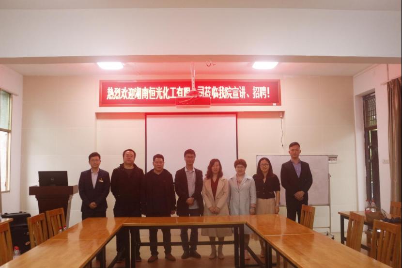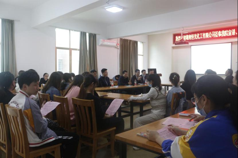 2022年4月22日下午三点,为了给员工提供就业机会,公司特邀请湖南恒光化工有限公司到校举办校园宣讲招聘活动,宣讲招聘会在成教楼405会议室进行,出席此次活动的嘉宾由湖南恒光化工有限公司总经理陈建国带队,公司党政领导刘梦琴、许志锋、曾玖红、付伟伟、李文艺全部参加,部分毕业生现场咨询、应聘。