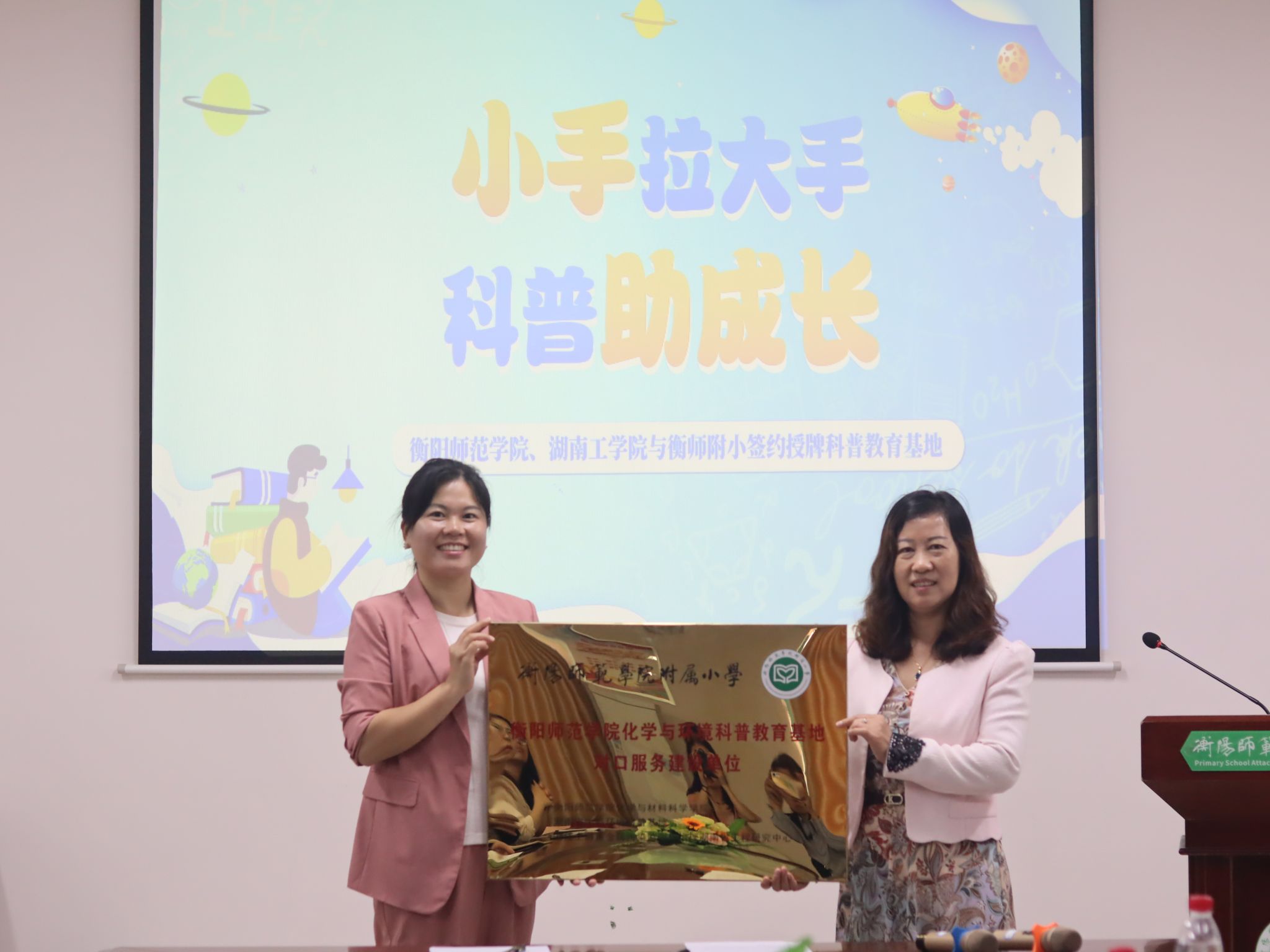 11月4日,tyc33455cc太阳成集团与tyc33455cc太阳成集团附属小学举行“化学与环境科普教育基地”签约授牌仪式。化学与材料科学公司党总支书记刘梦琴、副书记阳曼、副经理付伟伟以及衡师附小党总支书记、董事长邹利民、副董事长韩艳玲、罗灿、彭伟家等全体中层干部出席挂牌仪式。活动由附小副董事长韩艳玲主持。