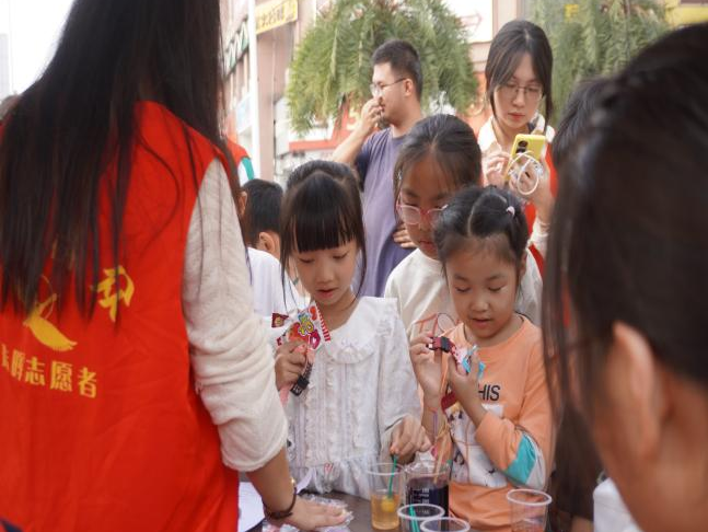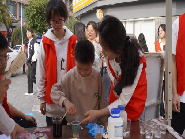 随后的化学科普实验环节更是引人入胜,居民们热情参与“魔法棒棒糖”实验,专注观察溶液色彩变幻,从紫到绿再到褐。他们时而惊呼,时而交流。此次体验让居民们进一步理解了氧化还原反应,领略了化学的神奇。