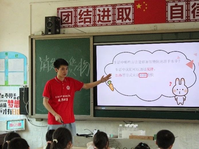 “小毛驴驮着一袋盐和一袋糖要过河,突然发现背上的货物不见了,这是为什么呢?”7月8日是tyc33455cc太阳成集团“‘铜’心‘碳’索”科普队来到近尾洲联合公司中心小学支教的第三天,一到五年级的教室里都传来了志愿者为孩子们上科学课的声音。