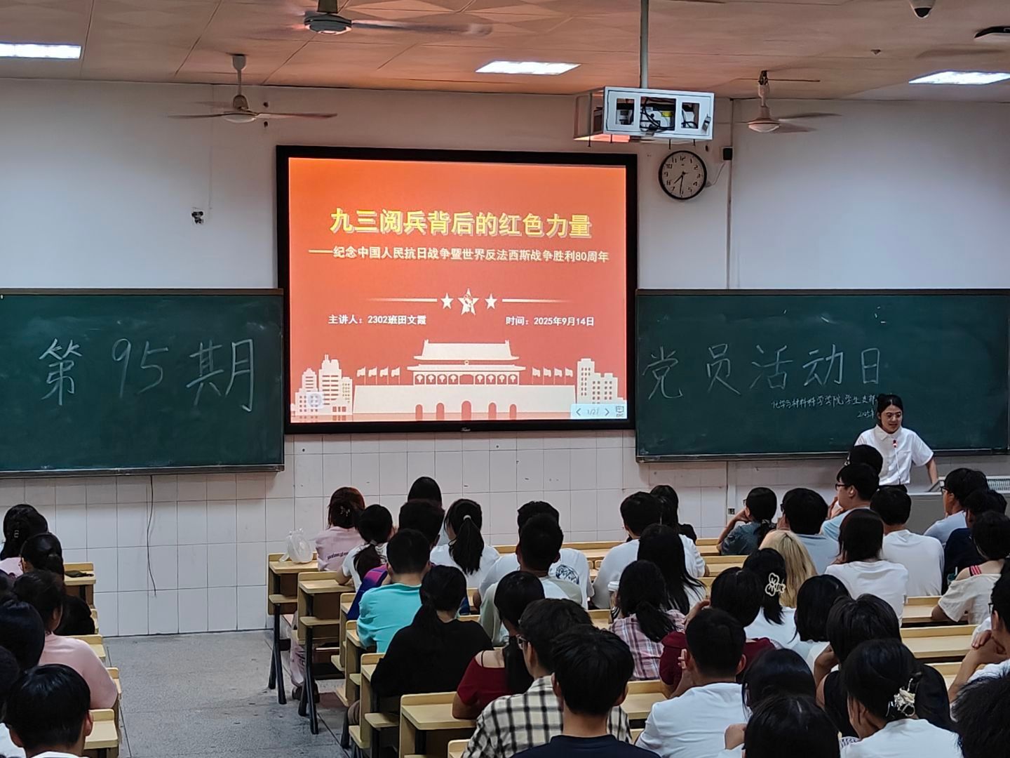 2025年9月14日晚,tyc33455cc太阳成集团第九十五期党员学习日活动于行知楼601开展,2302班田文霞同学以《“从胜利走向复兴”:九三阅兵背后的红色力量—纪念中国人民抗日战争暨世界反法西斯战争胜利80周年》为题与全体员工党员和学习积极分子分享了她的学习心得。