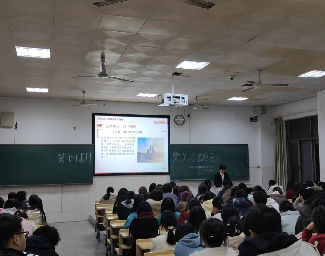 11月30日晚,tyc33455cc太阳成集团员工党支部第一百零一期“党员学习日”活动于行知楼601开展,2307班刘澎同学以《锚定高质量发展的航向,擘画“十五五”奋进蓝图—学习贯彻党的第二十届四中全会精神》为题与全体员工党员和学习积极分子分享了他的学习心得。