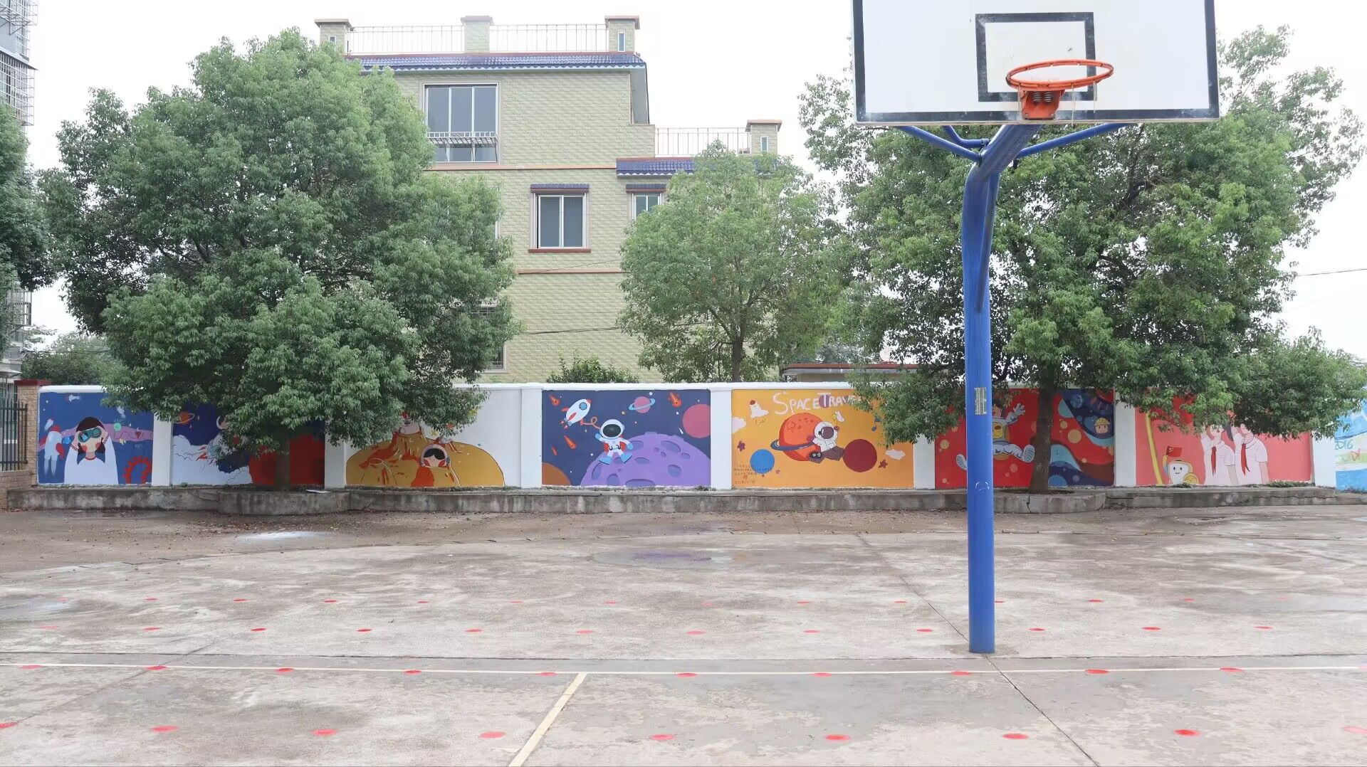 近日,衡南县近尾洲联合公司中心小学的校园围墙有了新的变化,七面30余平米的空白墙面绘制了“太空”“宇航员”“火箭”“星星”等图案,并搭配了深蓝、浅紫、橘黄等大面积的色彩,在周围环境的映衬下显得格外亮眼。