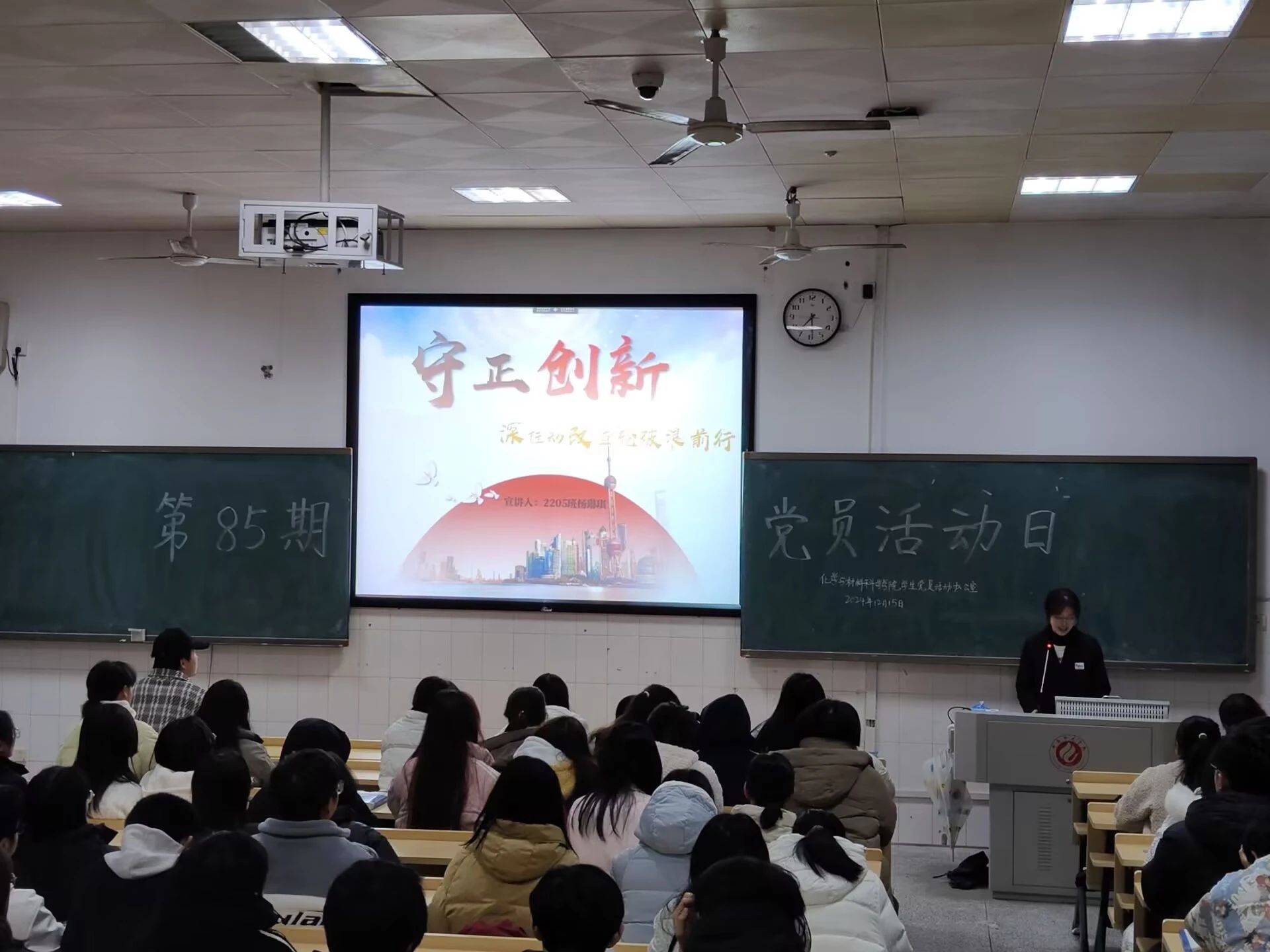 2024年12月15日晚,tyc33455cc太阳成集团第八十五期党员学习日活动于行知楼601开展,2205班杨琳琪同学以《“守正创新”推动深改巨轮“乘风破浪”》为题与全体员工党员和学习积极分子分享了她的学习心得。