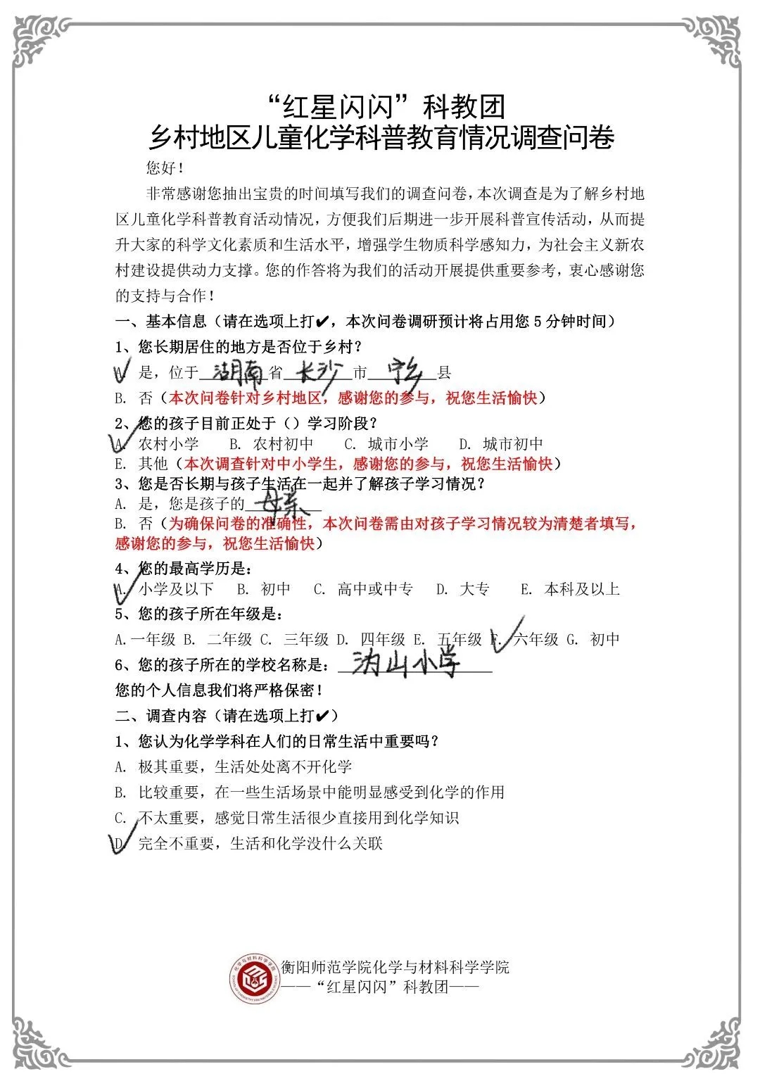 半个月以来,团队收集有效问卷463份,撰写了《乡村地区儿童化学科普教育现状调查报告》1份,授课30余节,一系列教研活动为团队创新开展乡村小学科学教育打下了扎实的基础,活动收获了家长们的一致好评,他们纷纷表示:“老员工们利用寒假将所学知识服务家乡,不仅是对自身能力的一种提升,也为小员工们树立了好榜样!”未来,“红星闪闪”科教团将持续推进趣味化学实验资料包研制,让趣味化学实验点亮更多乡村孩子们的科学梦。